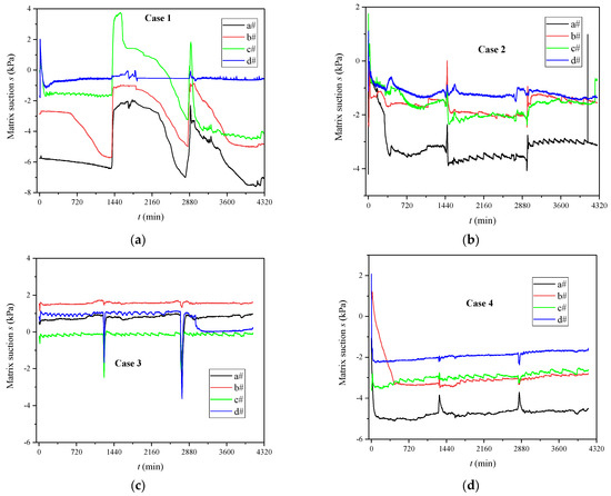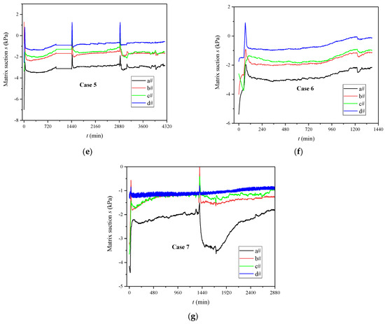 Evolution of matrix suction over time in (a) Case 1; (b) Case 2; (c) Case 3; (d) Case 4; (e) Case 5; (f) Case 6; (g) Case 7.