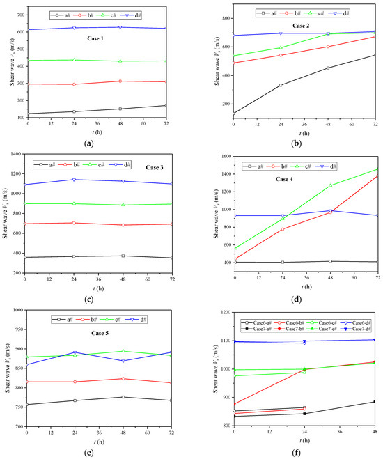 Evolution of shear wave velocity over time. (a) Case 1; (b) Case 2; (c) Case 3; (d) Case 4; (e) Case 5; (f) Case 6 and Case 7.