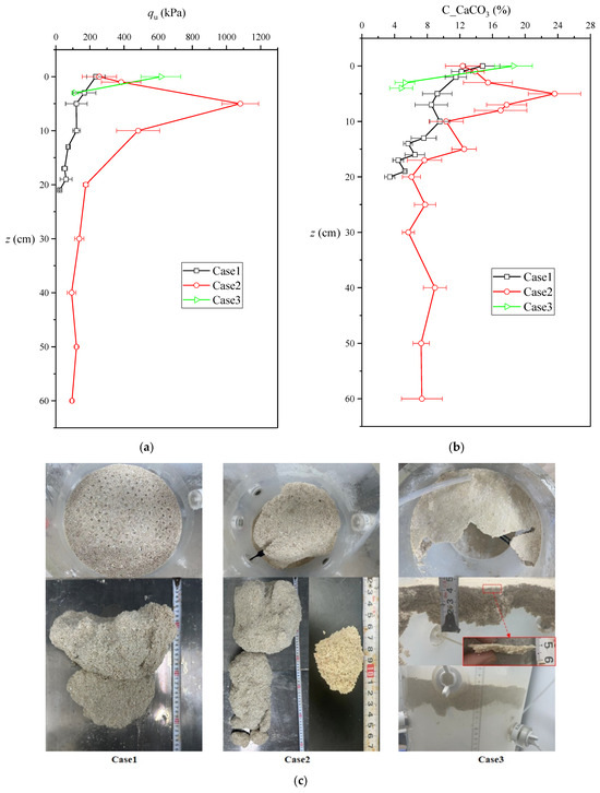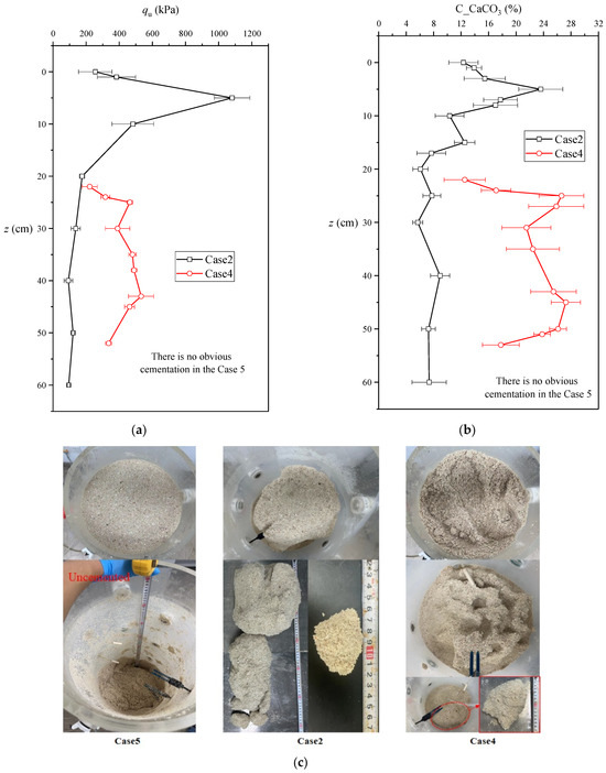 Figure 8c shows the cemented morphology of the sample after the test. It can be clearly found that there was an obvious cementation of calcareous sand at about 20 cm below the surface in the dry case, while the cementation with a depth of 60 cm was formed under the condition of the 0.5 m water level. When the calcareous sand was fully saturated, a hard crust appeared on the surface of the sample, and only about 5 cm of the surface layer showed obvious cementation. Compared with Case 1 and Case 2, the hard crust layer on the surface of Case 3 was denser. The main reasons were as follows: (1) The oxygen on the sample surface was sufficient, which was conducive to the growth and reproduction of microorganisms. Therefore, most microorganisms accumulated on the surface, thus forming a dense thin layer, thereby inhibiting the migration of solute deeper into the sample. (2) Compared with the completely dry case, the case with the water level of 0.5 m had a larger volumetric water content in the upper 0.28 m of the sample due to capillary action (Figure 5a–c). Microorganisms were more likely to migrate to the meniscus near the contacting position of particles to obtain sufficient water to maintain normal life activities, resulting in more particle bridging rather than particle wrapping, which greatly increased the cementation depth. In addition, it can be seen from Figure 8c that there were still large intergranular pores on the surface of Case 2, which was beneficial for the migration of solutes to greater depths.