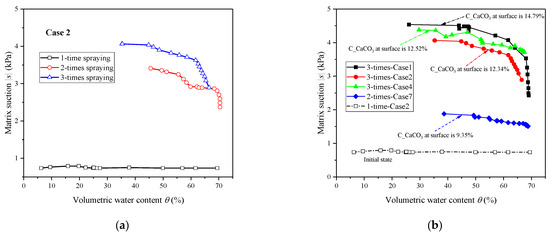 The MICP reaction generated calcium carbonate in the sand pores, which changed the pore structure and particle morphology, and then triggered a corresponding variation in the soil–water characteristic curve (SWRC). The analysis was performed according to the volumetric water content and matrix suction of Case 2 in the BS and CS spraying phases (about 15 min in every treatment). As shown in Figure 11a, the matrix suction of untreated calcareous sand was basically stable at 0.71~0.80 kPa with the increase in the volumetric water content. After 1 spraying treatment time, the calcium carbonate crystals blocked the pores, resulting in a significant increase in the matrix suction during the second spraying infiltration. The matrix suction decreased from 3.41 kPa to 2.37 kPa when the volumetric water content increased from 45.56% to 70.40%. When spraying for the third time, the calcium carbonate content inside the calcareous sand continued to increase, and the intergranular pores continued to decrease, resulting in an increase in the matrix suction of the cemented sand under the same volume water content. This phenomenon is consistent with Liu [28] and Saffari [37], which showed that the SWRC curve shifts to the upper right as the degree of cementation increases. Figure 11b summarizes the SWRC curve comparison of the third spray infiltration under different conditions, where the initial state was taken as the first spraying infiltration of Case 2. It can be found that the SWRC curve gradually moved up with the increase in the calcium carbonate content in the surface layer. This indicated that the water retention capacity of calcareous sand improved with the increase in the calcium carbonate content. In the conventional coordinate system, the distribution of matrix suction with the volumetric water content generally showed two kinds of variation laws: (1) linear decrease or constant, and (2) initial slow decrease to a certain volumetric water content and then rapid decrease.