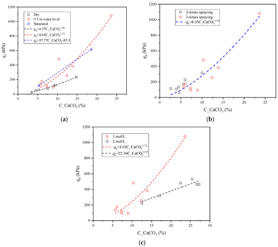 Figure 12b,c summarize the relationship between equivalent calcium carbonate content and penetration resistance under different spraying times and different concentrations, which can also be described by a power function in the form of Equation (3). The 3 spraying treatment times showed a higher calcium carbonate content and penetration resistance than the 2 spraying times. In the case of the high concentration of CS (2 mol/L), more calcium carbonate was produced and the maximum calcium carbonate content reached 27%. The maximum calcium carbonate content corresponding to 1 mol/L CS was 23%, which was slightly lower than that of 2 mol/L of CS, but the penetration resistance at 2 mol/L of concentration was less than that of 1 mol/L of concentration. This was attributed to the fact that the high concentration of CS produced irregular and weaker cementation, thus exerting poor strength.