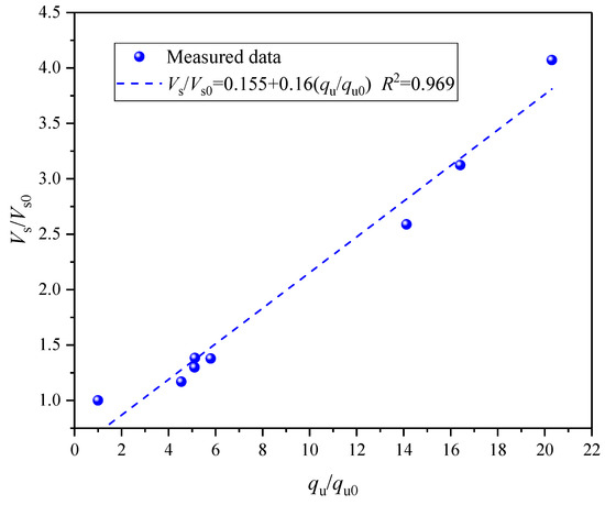 where Vs, Vs0, qu, and qu0 represent the current shear wave velocity, initial shear wave velocity, current penetration resistance, and initial penetration resistance, respectively. It should be noted that all the normalized penetration resistance values were not selected, but the penetration resistance corresponding to the measuring points with an obvious shear wave velocity increase was selected for normalization with the initial penetration resistance of uncemented sand.