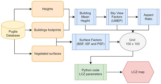 Following these calculations, a grid measuring 10 km × 10 km was established, with individual cells measuring 100 m × 100 m. Within this grid, mean values for the six aforementioned parameters were calculated for each cell using the Zonal Statistics tool. The corresponding parameter ranges for each LCZ were determined based on established criteria [28]. These parameters were subsequently incorporated into a Python code, enabling the generation of the LCZ map within the QGIS environment. It should be noted that this classification predominantly focuses on built-up classes, with natural cover classes primarily represented in extra-urban areas. A visual representation of this comprehensive process is provided in Figure 3.