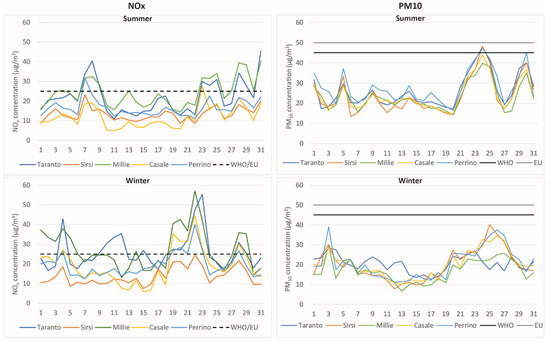 PM10 is associated with the development of respiratory diseases and allergies. According to the WHO, the safety limit average is 45 µg/m3 for 24 h, and the EU regulation is 50 µg/m3 for the same period (dashed lines in the figure). Figure 6 shows each air quality station’s daily mean value for winter and summer. In winter, none of the stations present any day over the standards. On the other hand, in summer, only three stations (Perrino, Taranto and SISRI) present one day over the WHO standard. This implies that the concentrations are not related to the activities surrounding the stations, as the three of them represent different characteristics.