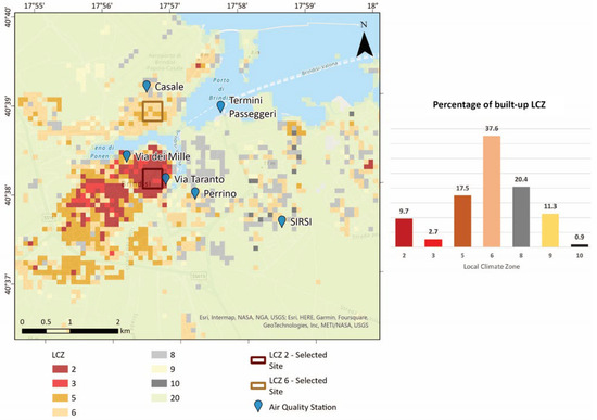 Figure 7 also shows the selected sites modeled in this paper. LCZ 2 and LCZ 6 are the two most frequent LCZs in each segment of built-up. At the same time, we will focus on areas where the population is higher and is exposed to poor air quality. The figure also shows the location of the air quality stations; LCZ 2 can be related to Via Taranto’s conditions, while LCZ 6 to Casale’s conditions.