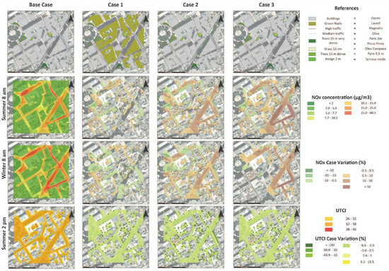As regards the effects generated by the considered cases, UTCI shows a general improvement that varies from 0.5 °C to more than 1 °C, and is more homogeneous in Case 2 than in Case 1. Regarding the NOx concentrations, each case presents particularities. Case 1 generates an improvement during winter, with a reduction from 2 to 5 µm/m3, except where traffic runs. At the same time, in summer, there is an increase in the concentrations (1 to 3 µm/m3), except on the north sidewalks, which present a light reduction. Finally, Case 2 shows that in both seasons, the NOx concentration increased (from 2 to 4 µm/m3), with a focus on the street center and the south of the intersection.