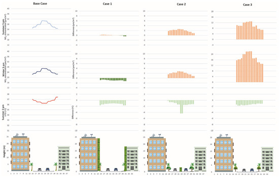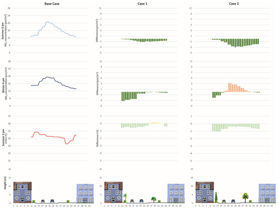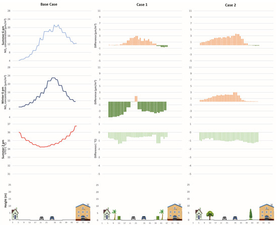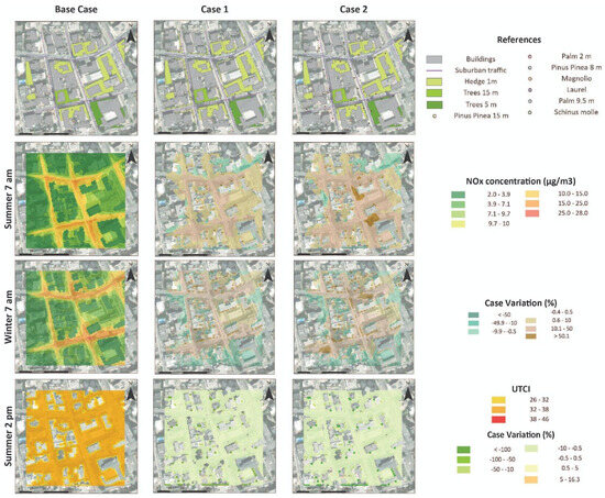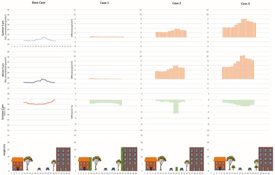 Two different GI implementations were tested on the site (Figure 9). Case 1 assumes a higher density of public trees on sidewalks and the addition of hedges in some corners where pollution is higher. Case 2 involves more evergreen trees to study their differential effects between summer and winter. The NOx concentrations in LCZ 6 are lower than in LCZ 2, which can be easily explained considering the different traffic flows in each area. During summer, only Case 2 overcame the WHO and EU regulations, while in winter, all the cases exceeded them; this implies that the climatic conditions interact with the concentrations of the pollutants. The comparison between models in LCZ 6 is shown in Table 6. Both summer and winter present lower values in the Base Case, while Case 1 shows a 10% increase and Case 2 presents a 50% increase.