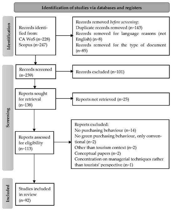 As the first step, we developed a review protocol and a search strategy. To find relevant publications for the topic, we followed specific review questions to select appropriate search keywords. We used the following algorithm for the search on the topic: (“Green Consumption” OR “Sustainable consumption “OR “Sustainable purchasing” OR “Green purchase” OR “Green purchasing” OR “Green consumer” OR “Green customer”) AND (“Hospitality” OR “Hotel” OR “Tourism” OR “Tourist” OR “Travel”). We utilised the Clarivate Analytics Web of Science (CA WoS) and Scopus search engines to find pertinent articles. These search engines are well regarded worldwide as leading sources and have been extensively utilised in previous studies [39,40]. The focus on high-impact journals indexed in the selected engines ensured the thoroughness and interdisciplinary approach. As a result, we gathered 228 records from CA WoS and 247 from Scopus, allowing us to comprehensively analyse the topic at hand.