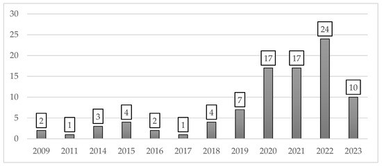 The initial step in obtaining valuable insights into research questions is transforming the data into a usable format. To attain this objective, all pertinent articles were scrupulously categorised in MAXQDA and MS Excel spreadsheets through a rigorous coding process. These codes acted as tags, enabling the retrieval and categorisation of similar data. Following this, the collected data were analysed through descriptive and thematic approaches. For the descriptive analysis, we employed a deductive approach and focused on classifying papers according to the year, journals, authors, methods applied, and research context, including the industries addressed, if any. We followed the classification Williams and Horodnic [42] suggested for the tourism industries. They offered a typology of tourism industries, including visitor accommodation, food and beverage serving activities, railway, road, water, air passenger transport, transport equipment rental, travel agencies, other reservation service activities, cultural activities, sports, and recreational activities. The thematic analysis was more inductive and designed to characterise the phenomenon of green consumption behaviour. We aimed to identify the theories addressing green consumption behaviour and determinants.