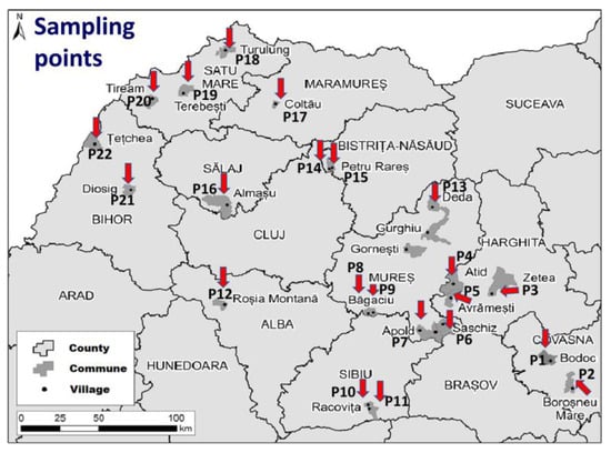 To evaluate the sources of POP pollution and the exposure of the population to these pollutants, 22 soil samples were taken from 22 different rural Roma communities from the Transylvania region, Romania, between May and August 2022. The distribution of the samples, and their code is presented in Figure 1. Soil samples were collected using a metallic shovel from a depth between 0 and 10 cm from a square with a side of 1 m. The samples were then placed in plastic bags and stored at a temperature of 5 °C until analysis. For representativeness, five samples were collected from each sampling point, which were later mixed and homogenised.