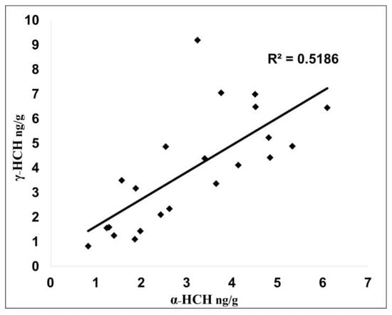 In the analysed soil samples, the α-HCH/γ-HCH ratio varied between 0.35 and 1.68, indicating that the HCHs is a cocktail of technical HCH and lindane application. Similar results were obtained on other soils from Romania []. Among HCH isomers, only α-HCH and γ-HCH were detected. This is strange because β-HCH, a component of the technical mixture of HCH or a degradation product of α-HCH and γ-HCH, was not detected in any sample, even though it is the most persistent and less volatile isomer and tends to accumulate in soil []. On the other hand, it is interesting to note that there is a significant correlation between α-HCH and γ-HCH (R2 = 0.5186) in the studied soils, even if technical HCH or lindane was used in the past (Figure 2). This correlation clearly reflects the degradation of γ-HCH to α-HCH [].
