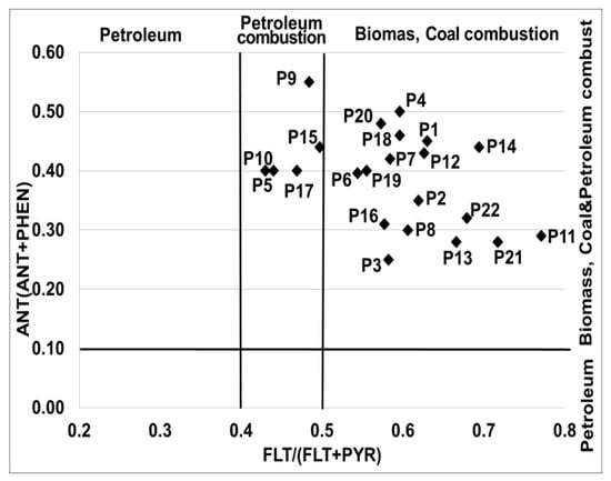 To better visualise the contribution of different sources to the soil PAH concentration, the cross plot of the isomeric ratios of ANT/(ANT + PHE) versus FLT/(FLT + PYR)) was plotted (Figure 4). The results suggest that the main sources of pollution in the analysed soil samples mixed petroleum combustion and biomass and coal combustion [].