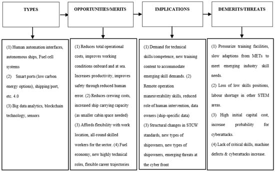 For many years, the maritime transportation industry has led the way in the automation of work processes. It has often relied on a careful blend of operational technologies and a highly skilled workforce to deliver on its mandate. Despite the huge initial capital investment, these technologies (both at the port and seaside) improve the productivity of the workforce [28,29] and empower operators to deliver goods to areas of high utility in an efficient manner at relatively reduced costs. Although some research argues that the emergency of technologies such as automated ships (smart vessels) might result in the loss of jobs to seafarers [8], the consensus remains that shipboard automation and similar Fourth Industrial Revolution technologies (Industry 4.0) springing up globally [30] and within the maritime transportation sector portend a positive outlook for both shoreside and shipboard efficiency [13,24]. Also, one can counterintuitively argue that rather than focusing on the supposed downsides of automation, a more constructive outlook is that it should rather instigate a rethink of existing training materials used by the Maritime Education Training Institutes (METIs) and other establishments primarily engaged in educating the industry’s workforce. These developments must rather inspire a switch to transferring analytical and technical competencies to give mariners and other maritime transportation industry workers a defined and sustainable career pathway.