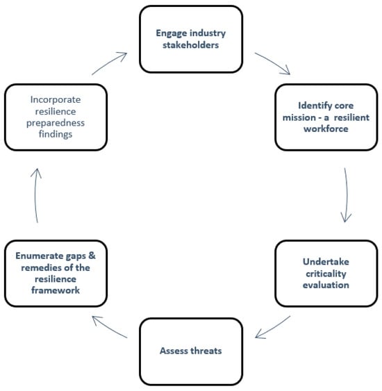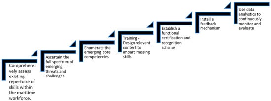 A resilient maritime workforce is agile—equipped to adapt to emerging industry changes, capable of withstanding and recovering from unforeseen disruptions within a reasonable timeframe [48]. Resilience thus lies in the ability of the workforce to return to a previous (or better) state after an incident while sustainability maintains a competitive advantage for stakeholders. Therefore, skill resilience borders on the capability of people to adapt to changes and unlearn and relearn new skills to make them agile within an industry experiencing skill transition. Such individuals can metamorphose their skills to meet emerging demands occasioned by technological changes and other pressures. The maritime industry is exposed to many threats and incidents (ranging from cyberattacks [49], pandemics and technological changes, etc.) that may result in severe disruptions and the ability of the industry to effectively respond to these incidents without significant disruptions to trade is contingent on the availability of a resilient maritime workforce. To realise such an adaptive workforce for the maritime industry, this paper proposes a skill resilience framework that assists in not only identifying existing/future training gaps but also improving training content. The latter goal of the skill resilience framework demands the introduction of innovative educational/learning models that prepare the maritime workforce to be creative and dexterous. This further requires an integration of a resilience mentality into the core activities of maritime industry employees (onshore and offshore). Skill development of seafarers needs to be construed as a core mission of employers and dovetailed into a holistic resilience framework to effectively respond to disruptive incidents. Figure 2 provides details on typical steps critical to a building resilience framework for the maritime workforce.