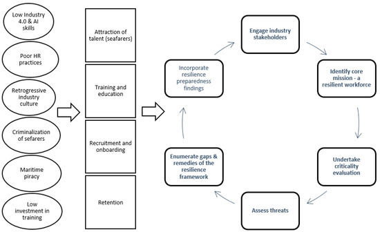 The essence of the framework process is to aid maritime industry employers with guidelines that could be used in sticking to their core mission (seamlessly supplying an adaptive workforce) before, during and after the occurrence of disruptive incidents. The established guidelines of the framework will also help to assess the resilience alertness of employers within the larger maritime industry. The framework process will need to focus on critical areas such as the attraction of talent (seafarers), training and education, recruitment and retention (dealing with strategies that elongate the working years of serving seafarers onboard ships or perpetuate their stay on the port side of the larger maritime industry without losing them to other sectors). More importantly, recent studies suggest that the framework process may need to single out the retention of highly skilled workers for special attention [15,19,50]. Focusing on these four key areas will ensure that the framework aligns with the core mission of employers and other industry stakeholders concerned with the availability of a resilient workforce. Thus, the areas are intricately linked to the movement of skilled talents within the global maritime industry.