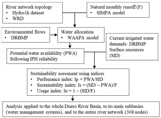 Briefly, the WAAPA model was applied to simulate water allocation in each node of the Duero River network, considering natural surface water resources. Then, the PWA was computed. The PWA was compared to the surface water irrigation demand (SID, defined in the DBRMP) to evaluate sustainability. A group of indices was set for performing an objective sustainability assessment. These values were computed for each node in the river network (total of 308 nodes) and assessed at the basin and main subbasins (water management systems) levels. In addition, the performance along the main river course was evaluated. The model is described in Section 2.1. The data used to define the model topology, water resources (runoff), reliability, and current irrigation demands are detailed in Section 2.2. Finally, the indices used to assess the sustainability of the systems are defined in Section 2.3. Figure 1 shows a general scheme of the applied methodology.
