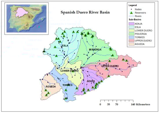 The WAAPA model was applied to the Spanish territory of the International Duero River basin. Figure 2 shows the drainage areas corresponding to the seven (7) sub-basins that were considered in the study area. Upper and Lower Duero are sub-basins that contain the Duero axis. These catchments picked inflows up from the Esla, Pisuerga, and Adaja sub-basins. Reservoirs with a storage capacity of at least 1 hm3 (46 reservoirs) were considered within the study area. The regulation capacity of hydropower reservoirs was neglected because it was considered that hydropower operators are free to discretionally manage their reservoirs within the limits set by the Basin Authority. In addition, they often perform seasonal regulations. This practice, which increases the availability of water for consumption, was not included in the model.