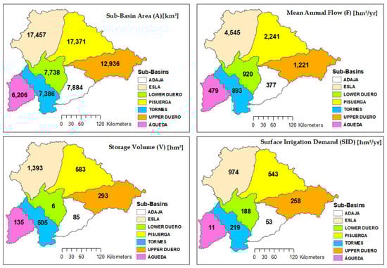 Inputs and main characteristics considered for this study mapped by sub-basin: area (A); mean annual flow (F); storage volume (V); and surface irrigation demand (SID).