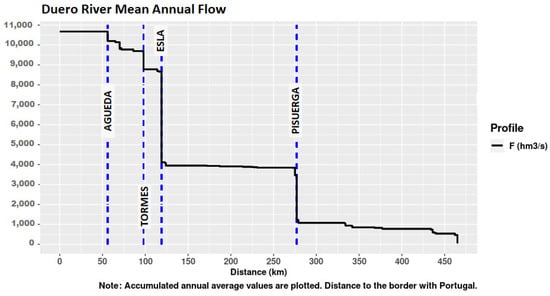 Figure 4 shows the evolution of the mean annual flow along the Duero basin for a time slice from 1940/1941 to 2017/2018, graphically indicating the relative importance of its main tributaries, which correspond to the considered sub-basins. As accumulative values were represented, the growth of the variable was accompanied by a shift along the river from the headwaters downstream. Each point in the channel was positioned on the current according to its distance from Portugal. The jumps represent water inflows to the principal system, as the values of the variables were provided by the model at the nodes. The blue vertical lines indicate the point of the contribution of each sub-basin at its confluence with the main channel. The blue line of the inflow of the Adaja sub-basin was not plotted because it is a smaller jump and it is simultaneous with the Pisuerga sub-basin inflow point. The reaches of the Upper and Lower Duero sub-basins coincide with the main channel, and their differential contributions cannot be seen in Figure 4. The Esla sub-basin is the largest contributor to the Duero basin, followed by the Pisuerga sub-basin. The Tormes and Águeda sub-basins are the closest contributors to the Portugal border.