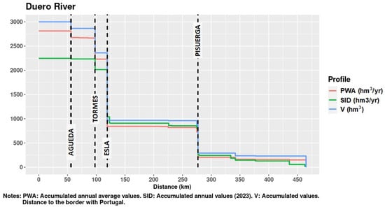 Figure 5 shows the longitudinal results obtained from representing the spatial evolution of the volume of the reservoir, in hm3 (V), the potential mean annual volume to satisfy irrigation, in hm3/yr (PWA), and the volume of annual surface irrigation demand, in hm3/yr (SID), along the axis of the Duero. The graphical representation of the vertical black lines follows the same criteria as those in Figure 4.