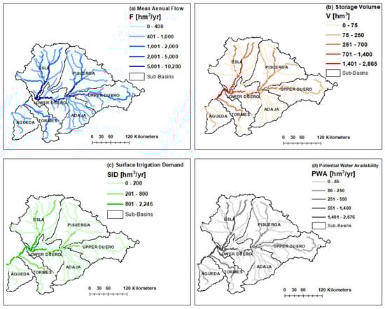 Spatial distribution of the variables used in this study. Accumulated values are plotted. Input data for the WAAPA model: (a) mean annual flows, F, in hm3/yr; (b) storage volume, V, in hm3/yr. Output data from the WAAPA model: (d) potential water availability, PWA, in hm3/yr. Contrast variable: (c) surface irrigation demand, SID, in hm3/yr.