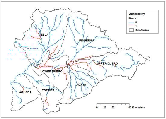 Graphical analysis of the short-term sustainability of accumulated demands in the Duero River. Vulnerable reaches, where PWA is less than SID, are represented in red (1); and the non-vulnerable reaches, where PWA is greater than or equal to SID, are represented in blue (0).