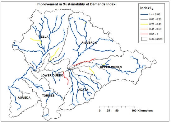 Figure 8 shows the IS values along the fluvial network of the sub-basins. The value of the Improvement in Sustainability of Demands Index (IS) for the network was computed at each node. Negative values (in blue) indicate that there are no problems with the short-term sustainability of irrigation demands. Most of the sub-basins are problem-free. Positive values (colored according to scale) estimate the percentage of natural resources to be mobilized to solve the short-term sustainability problems of irrigation demands. It is also noted that a large part of the network affected by irrigation shortages can solve this situation by increasing its regulation by a small percentage (less than 20%).