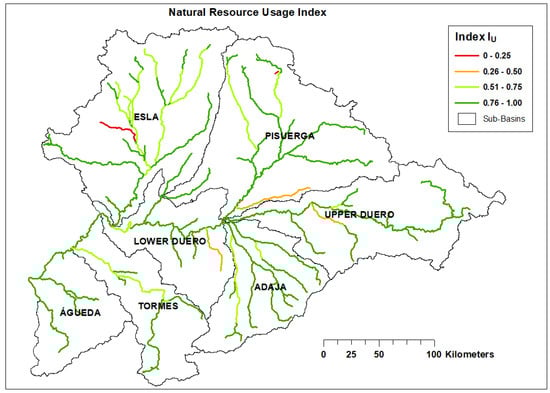 Graphical representation of the level of use of natural resources in the Duero basin using the value of the Usage Index (IU) in the event that the demands are completely satisfied.