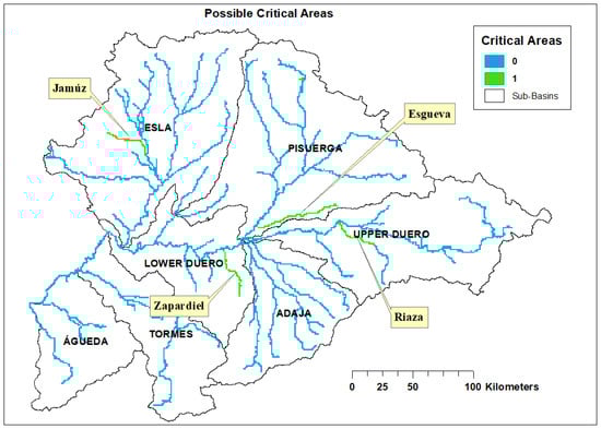 Graphical representation of possible critical areas in the Duero basin. In green (with a value of one) are the areas in which IS > 0 and IU < 0.5.