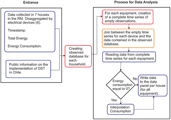 There were then 42 .csv files, where each file represented the daily measurement, with minute frequency, of the electrical energy consumption for each device within a house. The data were grouped into 7 different houses, in which the behavior of the consumption of each device, and of each house, at each moment in the considered time was collected. To obtain the final database, a data processing was carried out that included different stages (see Figure 1), starting with the respective arrangement of the data, to subsequently adding and encoding the necessary variables for the econometric modeling of consumption, which were of our own elaboration, such as the application of DST.