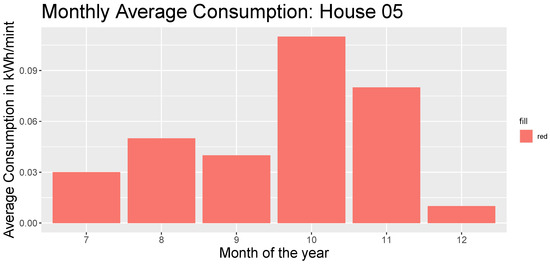 Next, we present some of the most important descriptive statistics to understand the phenomenon addressed in this research. In particular, average consumption statistics will be shown for each of the months considered in the aforementioned data panel. This will only be performed for two representative houses from the group under study. Figure 2 shows a bar graph of the average consumption recorded in House 05, during the time window from July to December. As the reader can observe, the months of October and November were where a greater increase in energy consumption was generated.