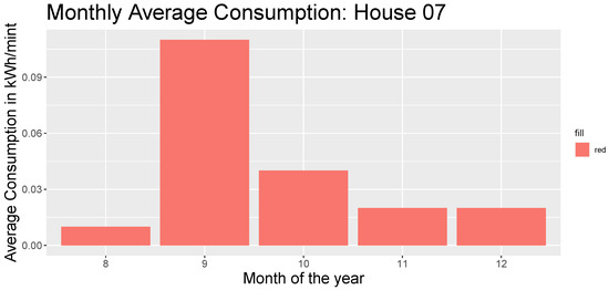 Clearly, there was an observable upward trend in the average consumption of the end-of-year months (except for September, where there may be a seasonal effect due to the number of holidays). This is in line with many aggregate behaviors that remain over time, including the upward trend in energy demand. However, it is also notable that the increase in average consumption was greater in October than in November. That is, energy consumption did not increase as summer approached. This type of behavior could also be related to the implementation of the daylight saving time policy. The purpose of measuring the application of this policy was to better identify and understand the differences observed in this case analysis. Below, we replicated this graph of monthly consumption behavior, now for house 07 of the group (Figure 3) (“Since the interpolation algorithm was applied to the data from house 07, the original database contains only a few observations for that month, with ‘0’ consumption. Therefore the LOCF interpolation method replaced that zero for the whole month. This represents then an average consumption of “0” which is not reflected in the graph”).