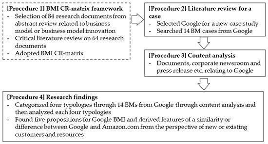This paper is organized as follows. Section 2 summarizes extant research on BMI and BMI typology. Section 3 introduces the research methodology, case studies, and content analysis of case documents. Section 4 introduces the research framework of the BMI CR-matrix. Section 5 describes an empirical case study by applying the BMI CR-matrix to 14 BMs of Google and drawing five propositions and the similarities and differences between Google and Amazon.com. Finally, Section 6 summarizes the contribution, presents its implications, and discusses its limitations along with directions for future research.