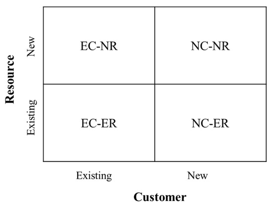 As shown in Figure 2, the BMI CR-matrix classifies BMIs into four groups (EC-ER, EC-NR, NC-ER, and NC-NR) based on whether customers and resources have already been secured or need to be acquired, where EC-NR stands for BMIs based on existing customers (EC) and new resources (NR).