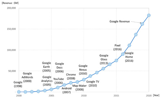 Google LLC was established in 1998 as a provider of Internet search services. It recorded sales of about USD 182.5 billion in 2020 and ranked fourth in global brand rankings in 2021 [50]. It has achieved continuous and sustainable growth since 2000, as shown in Figure 3. In 2000, it had a USD 15 million operating profit deficit with USD 19 million in sales. However, it grew 1500 times over the next ten years to USD 29.3 billion in 2010, and nearly 4.8 times from 2011 to 2020 [51]. Google, arguably the most successful example of an innovative digital technology company, has achieved sustainable growth by introducing a variety of new BMs through continuous BMI, as shown in Figure 1.