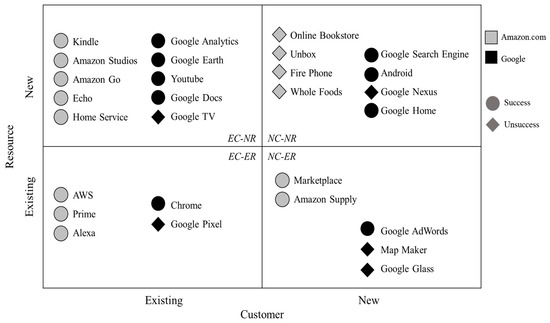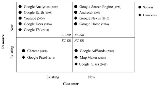 In the literature, existing resources can be leveraged to achieve success if they provide clear advantages for competition and values to customers [56,57]. Google has five BMs based on existing resources, with two targeting existing customers (EC-ER) and three targeting new customers (NC-ER). However, only two cases succeeded, while three did not.