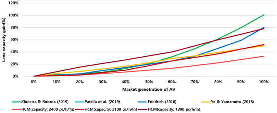 Predicted capacity gain of AVs at different levels of market penetration [11,13,17,18].