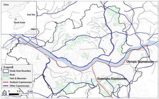 We targeted the city of Seoul, the capital of South Korea (Figure 2) and home to 9.6 million people (18.55% of the total population of South Korea as of 2022). Seoul has a relatively high transit mode share compared to other global cities by virtue of a well-established transit network and transit-oriented development. This transit network is credited for changing the spatial structure of Seoul to decentralized from monocentric. Indeed, the mode share of public transit in Seoul is approximately 70% [32]. It is also known that 31.9 million trips are generated by all motorized travel modes every day, and that 17 expressways are under operation in Seoul, handling high-speed traffic and providing rapid mobility for long trips.