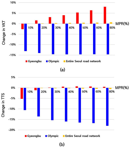 In the case of the Olympic Expressway, traffic volume tended to increase with MPR, similarly to the Gyeongbu Expressway, with a maximum change of 9.11% at 80% MPR. However, at 10% MPR, traffic volume decreased, contrary to the results at other MPR. In contrast to the results for the Gyeongbu Expressway, VKT and TTS decreased compared to the base scenario. Our results showed percentage changes ranging between −13.09% and −14.61%, and between −10.6% and −18.08%, respectively, for VKT and TTS. Meanwhile, as expected, travel speeds increased for all MPR, with a minimum change of 0.88% at 20% MPR and a maximum change of 4.27% at 80% MPR.