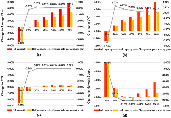 Comparison of percentage changes between full capacity and half capacity on the Gyeongbu Expressway. (a) Average flow, (b) VKT, (c) TTS, and (d) network speed.
