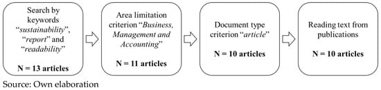 This process started with an exploratory analysis and registration of scientific articles. Systematic searches were conducted from 11 November 2022 to 15 January 2023. The Scopus database was searched to collect documents covering all studies on the readability of non-financial reports, with a focus on sustainability. To this end, the following search string was constructed and entered into the aforementioned database. It should also be noted that Microsoft Excel was used for data processing. According to the literature that served as a basis for this research, presented in Section 3, regarding the readability of non-financial reports, we conducted a search in the Scopus database, using the terms “sustainability”, “report”, and “readability”. This initial search was conducted with limitations, as the above terms were only considered for journal titles, abstracts, and keywords. With this filtering process, the search yielded 13 results. Figure 1 presents the data collection process, which is explained below.