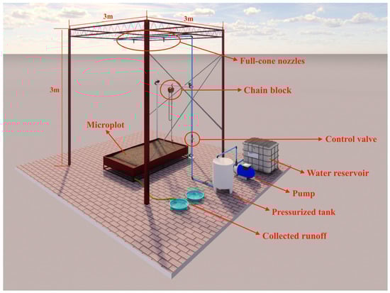 In this study, 8 rainfall gauges were mounted on the microplot spaced at 0.30 m apart to collect the rainfall volume, illustrated in Figure 3B. Each rainfall event lasted for 15 min and was taken in three replicates. The control valve was used to adjust the pressure in the sprinkler system to achieve the desired rainfall intensity.