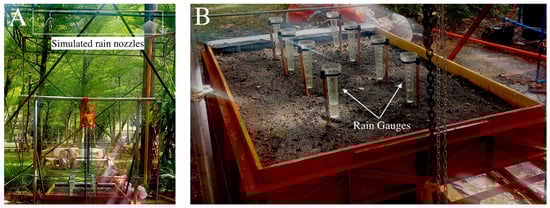 Simulated experimental setup. (A) Nozzles for the simulated rain; (B) rain gauges used on the experimental plot to measure uniformity of simulated rainfall.