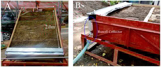 The experimental microplots were prepared under simulated and natural rainfall events. The microplot under simulated rainfall, shown in Figure 4A, had a dimension of 2.0 × 1.2 m with a depth of 0.25 m, based on the study of Quan et al. (2020) [33]. One side of the microplot bed frame was fastened with a chain block, allowing for adjustments to vary the inclination of the microplot to obtain the desired slope of the plots at 5°, 10°, and 20°. The soil placement in the plot had a total depth of 20 cm, and a 5 cm frame clearance on the surface was provided for the splash effect. A gutter was affixed to the end of the microplot to gather the runoff (Figure 4B). Similarly, the microplots under natural rainfall events had a dimension of 2.8 × 1.0 m, with a slope of 20° (Figure 5A). A runoff collector was also installed at the lowest end of the plots. The soil type used in all the microplots was a combination of coarse sand and silt since they have a beneficial impact on soil splash observation [34,35]. A total compaction effort of 23.5 kJ/m3 was applied to all microplots for a total depth of 20 cm [36].