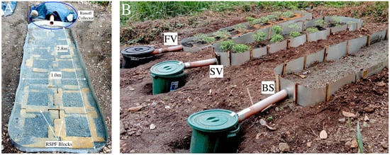 Microplots on a field with a 20° slope under natural rainfall event: (A) field setup showing soil with RSPF blocks (SF) plot; (B) field setups showing RSPF blocks with vegetation (FV), soil with vegetation (SV), and bare soil (BS) plots.