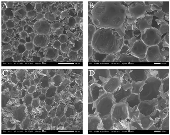 Scanning electron microscopy (SEM) images of polyurethane foams using a secondary electron absorber (SED) at 10.0 kV high vacuum with a probe current of 40.0 μA: (A,B) control petroleum-based PU foam (CPPF) at ×50 and ×100 magnification, respectively; (C,D) rice straw-based PU foam (RSPF) at ×50 and ×100 magnification, respectively.