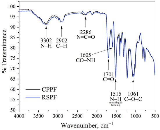 FTIR is a commonly used analytical technique that can provide information about the chemical composition and structure of materials. When applied to PU foam, FTIR can reveal information about the types of chemical bonds present in the material, as well as any functional groups that may be present. The FTIR spectra of the RSPF and CPPF blocks are shown in Figure 7. The peak at 3302 cm−1 represents the N–H stretching of the urethane bonds. Moreover, the low intensity of the N–H band signals the presence of little to no excess OH groups. This is generally a characteristic of rigid PU foam due to a high isocyanate index [46]. This means that almost all the OH groups have reacted, producing a highly crosslinked foam, thus increasing the rigidity of the foam. The slightly greater intensity of the N–H band of the RSPF sample is consistent with the higher OH number of the rice straw-based polyol, thus producing more urethane bonds during foam formation. The bands at 2902 cm−1 are C–H stretching groups. The weak bands at 2286 cm−1 show the stretching vibrations of unreacted N=C=O groups from the isocyanate. Furthermore, the sharp C=O stretching bands at 1701 cm−1 and the stretching peak of CO–NH at 1605 cm−1 (between 1701 cm−1 and 1515 cm−1) verify the formation of urethane linkages in the RSPF network. In the same manner, the sharp peaks at 1515 cm−1 denote the N–H bending and stretching vibrations, while the intense band at 1061 cm−1 shows the C–O–C vibrations in the urethanes.