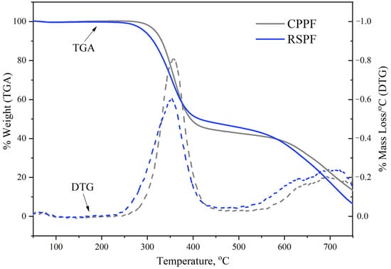 The thermal degradation of RSPF was measured at the temperature range of 50–850 °C using the Shimadzu DTG-60H (Shimadzu Corp., Kyoto, Japan) with a heating rate of 10 °C/min and a nitrogen flow rate of 20 mL/min.