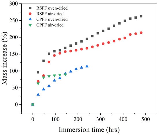 The water absorption test results are plotted in Figure 9. The RSPF and CPPF samples were preconditioned in two different ways: one set of foam samples was air-dried, while another set was oven-dried for 24 h before being subjected to water absorption according to ASTM C272/C272M [30]. The data in Figure 9 show that the RSPF samples exhibited a very high absorption capacity. During the first 24 h of soaking in water, the average increase in the mass of RSPF was 69% for air-dried and 96% for oven-dried samples. The difference between these values suggests that RSPF absorbs and retains some moisture from the air. A further immersion resulted in 214% and 262% water absorption at the end of 480 h for the air-dried and oven-dried samples, respectively. At this point, the change in the weight of the foam samples was negligible; thus, it can be deduced that this is the saturation point of RSPF samples. On the other hand, the CPPF samples only amassed a 113% and 89% increase in mass at their saturation point of 240 h of immersion for the oven-dried and air-dried samples, respectively.