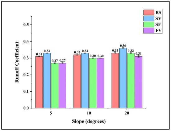 Runoff coefficient under simulated rainfall for bare soil (BS), soil with vegetation (SV), soil with embedded RSPF blocks (SF), and soil with RSPF blocks and vegetation (FV) microplots at varying plot slopes, showing a general decrease in runoff coefficients for SF and FV.